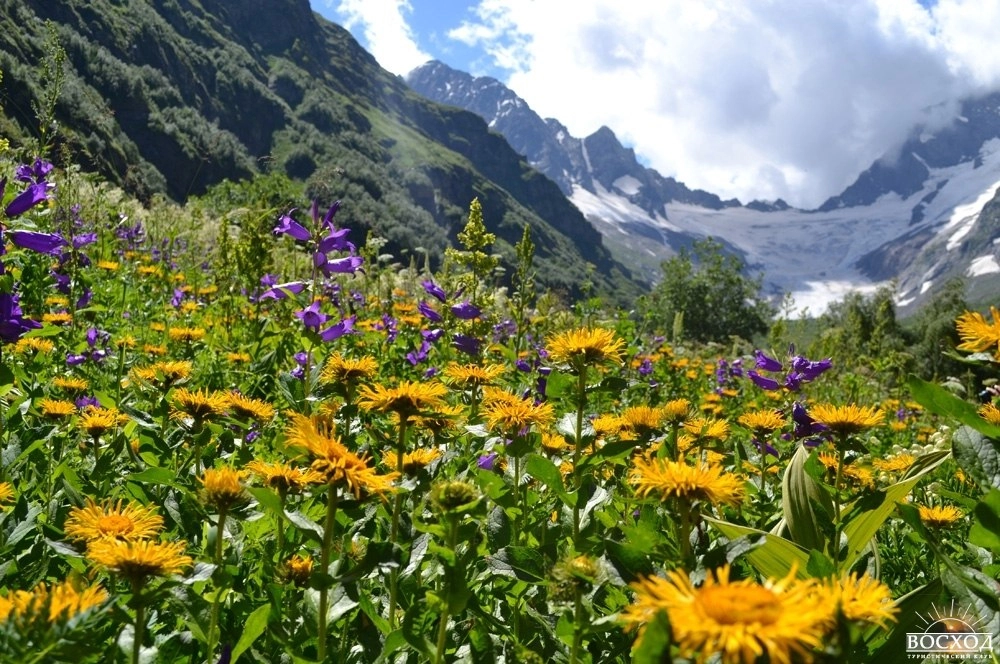 Природа: перевалы Главного Кавказа: альпийские луга, снежные вершины, реки с ледниковой водой.