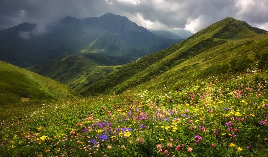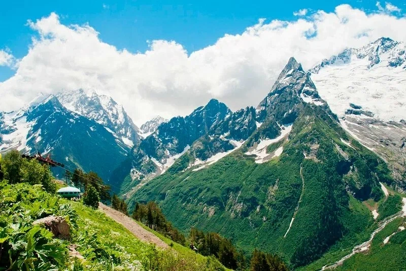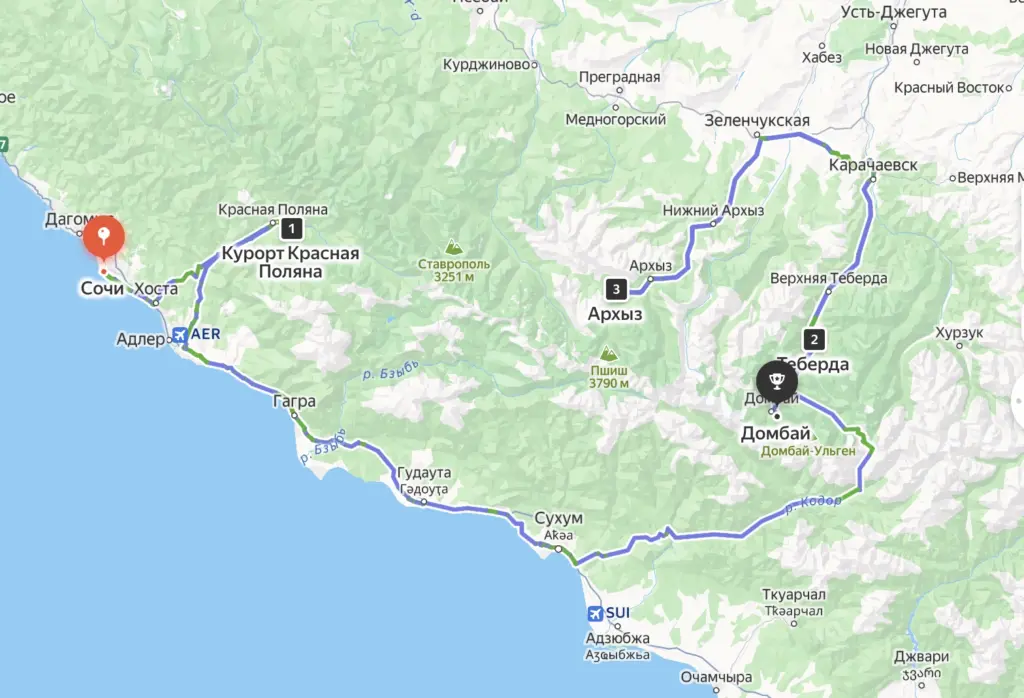 Формат: 5–7 дней, 300–450 км. Черноморское побережье и горные маршруты: Сочи — Красная Поляна — Теберда — Архыз — Домбай.