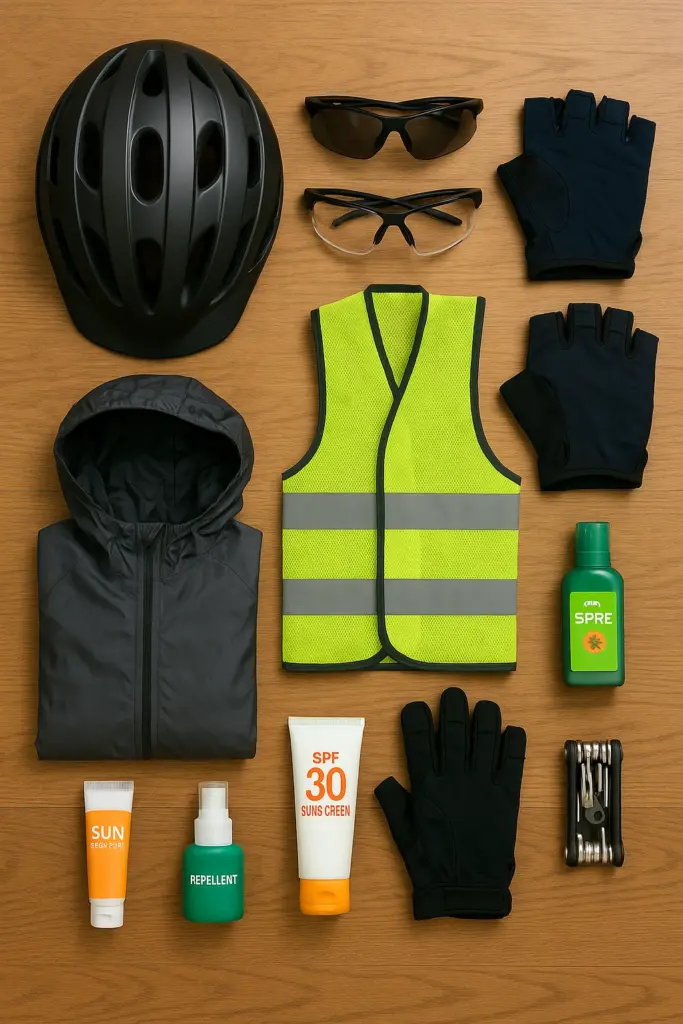 • Шлем, очки (clear/SMOKE), перчатки, накидка от дождя, жилет/светоотражалки, крем от солнца, репеллент.