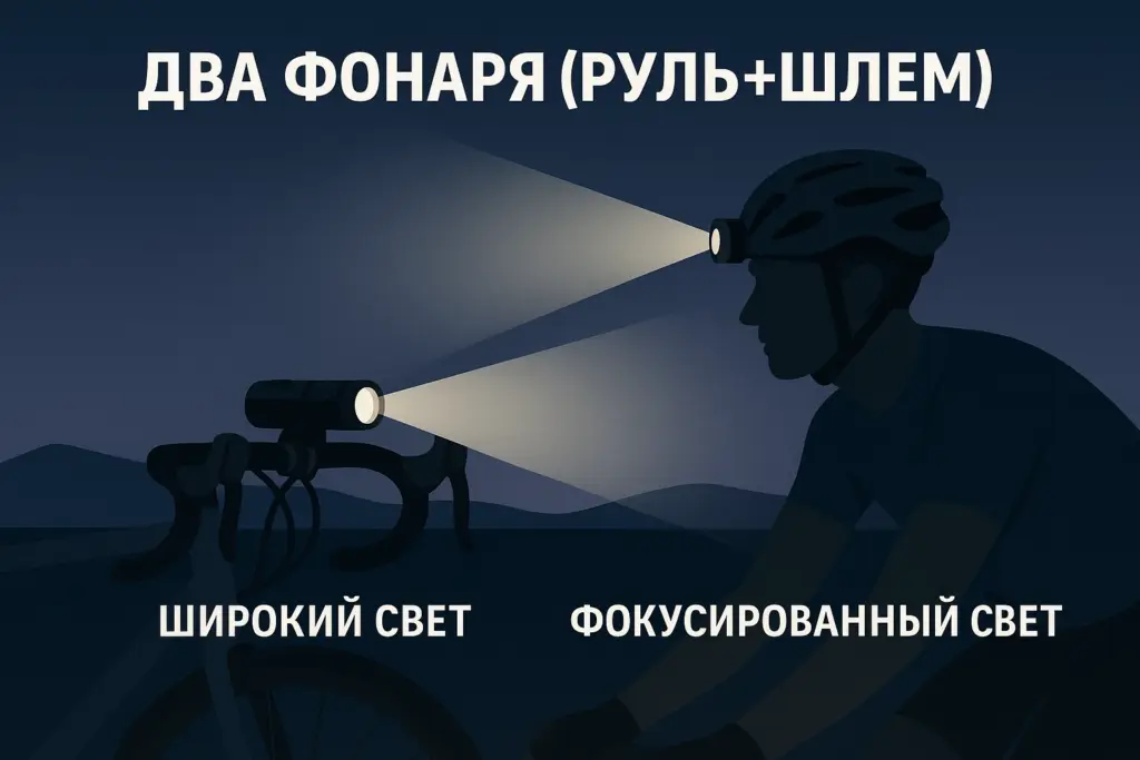 Идеально — два спереди: на руле (стабильный широкий луч) + на шлеме (куда смотрите — туда свет). Сзади — два габарита (на подседеле/раме и на сумке/джерси). Дублирование = надёжность.