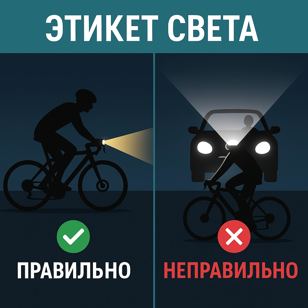 Опустите луч так, чтобы не слепить встречных и одновременно видеть разметку/кромку. Для шоссе → чуть «вниз-вперёд»; для МТБ → дальше и шире, добавив шлемный фонарь для «заглядывания» в повороты.