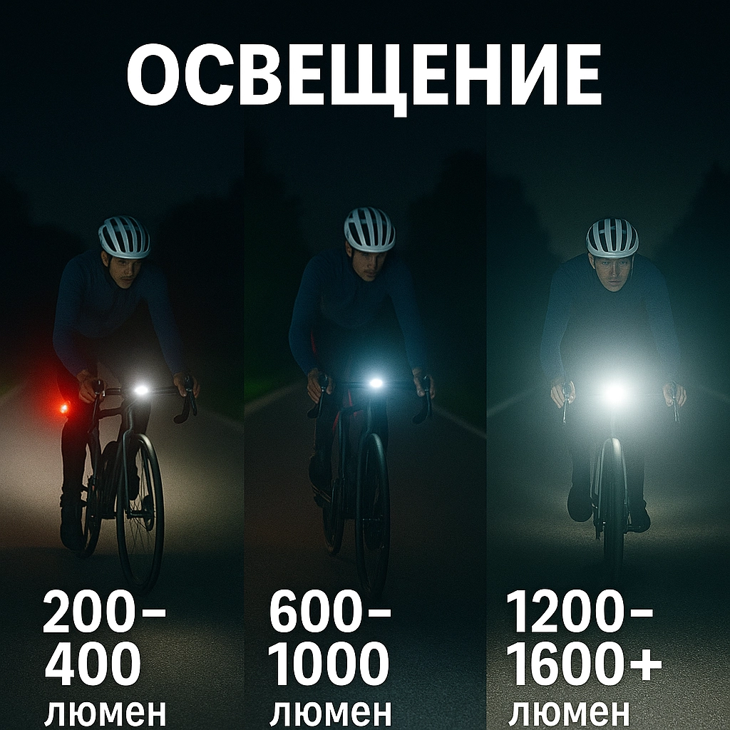 - Гравий/МТБ без фонарей на трассе: передний 1200–1600+ лм (лучше два источника — на руле и на шлеме), задний 50–100 лм.