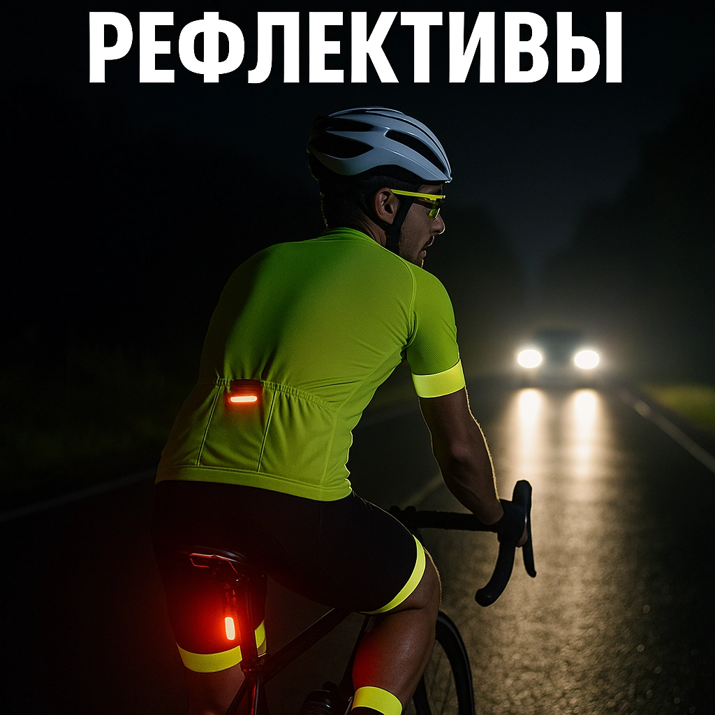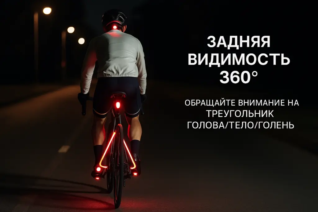 - “Треугольник движения”: отражающие элементы на голове (шлем), теле/куртке и лодыжках (движущийся источник внимания).