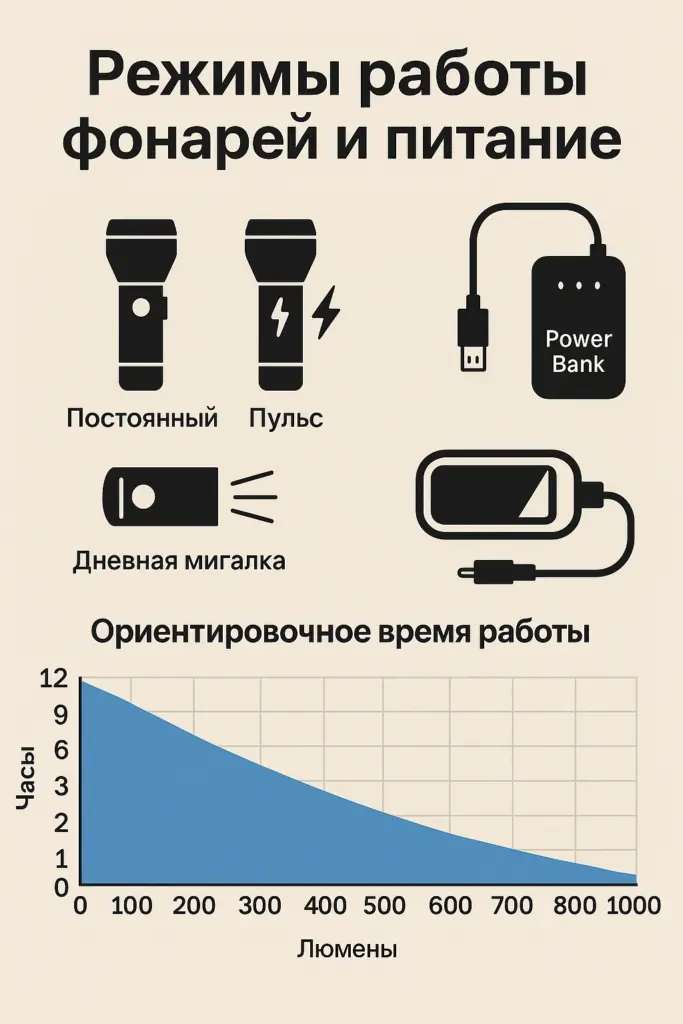 Берите свет с реальными 2–3 часами в нужном режиме. В дорогу — powerbank или сменный аккумулятор. Холод сокращает автономность — держите пауэрбанк ближе к телу.