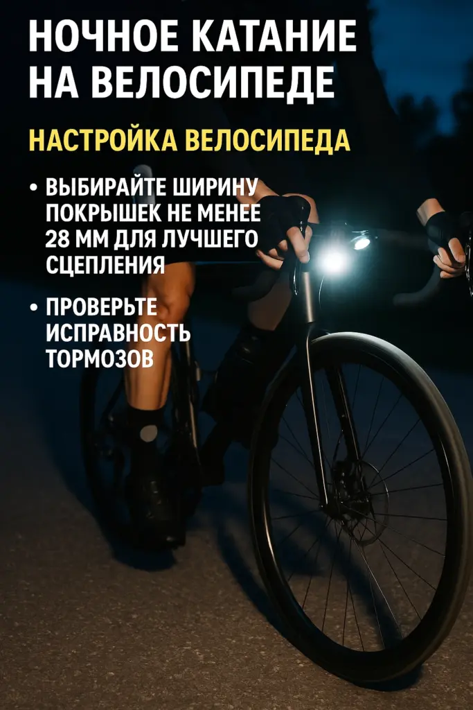 - Тормоза: проверьте износ колодок, чистоту роторов/ободов; ночью дистанции реакции длиннее.
