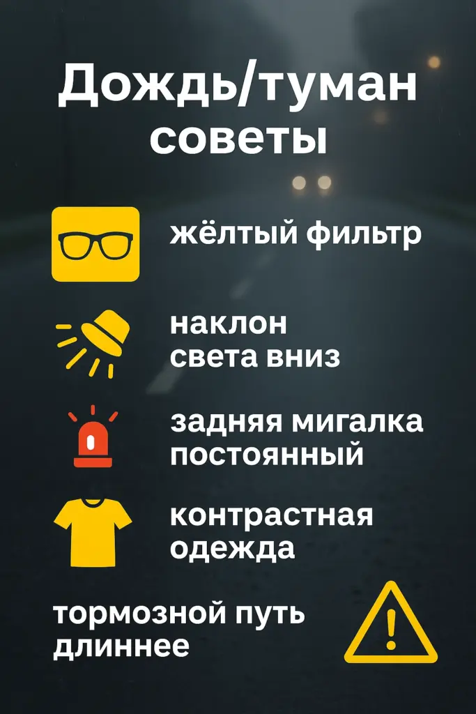 - Группа: держите дистанцию чуть больше дневной, задний фонарь в мягком режиме. Руки — на тормозах.