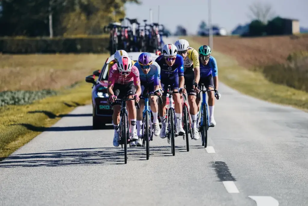 Ключевой ход родился на последних трёх грунтовых секторах, когда Поль Лапейра (Decathlon AG2R) и 21-летний Тибо Грёль (Groupama-FDJ) уехали на 30–15 секунд. Пыль, ветер, несогласованность позади — и в какой-то момент казалось, что дуэт довезёт. Гравий в свою очередь раздавал «штрафы»: Йонас Абрахамсен, Арно де Ли, Тобиас Лунд Андресен ловили проколы и возвращались через группы. На фоне этих качелей в контратаку ушёл мини-погон из пяти: Кристоф Лапорт, Маттео Трентин, Стефан Биссеггер, Маттиас Вацек и Альберт Витэн Филипсен. Но даже им удавалось держать лишь «–10» — не больше.