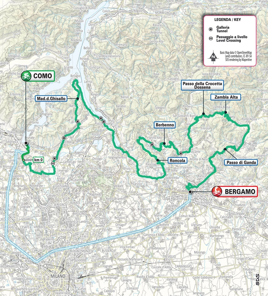 Организаторы подтверждают: Комо → Бергамо, рельеф почти без «плато» во второй половине дистанции. Ключевые ориентиры: