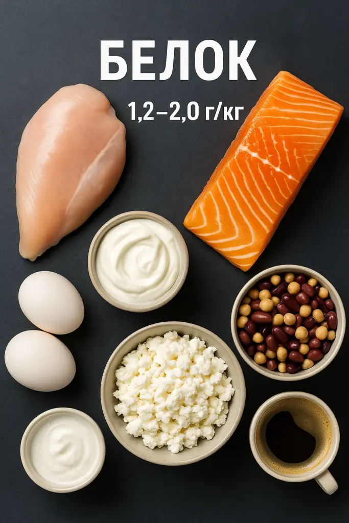 Сутки: 1,2–2,0 г/кг, в тяжёлые недели до 1,7–2,2 г/кг.