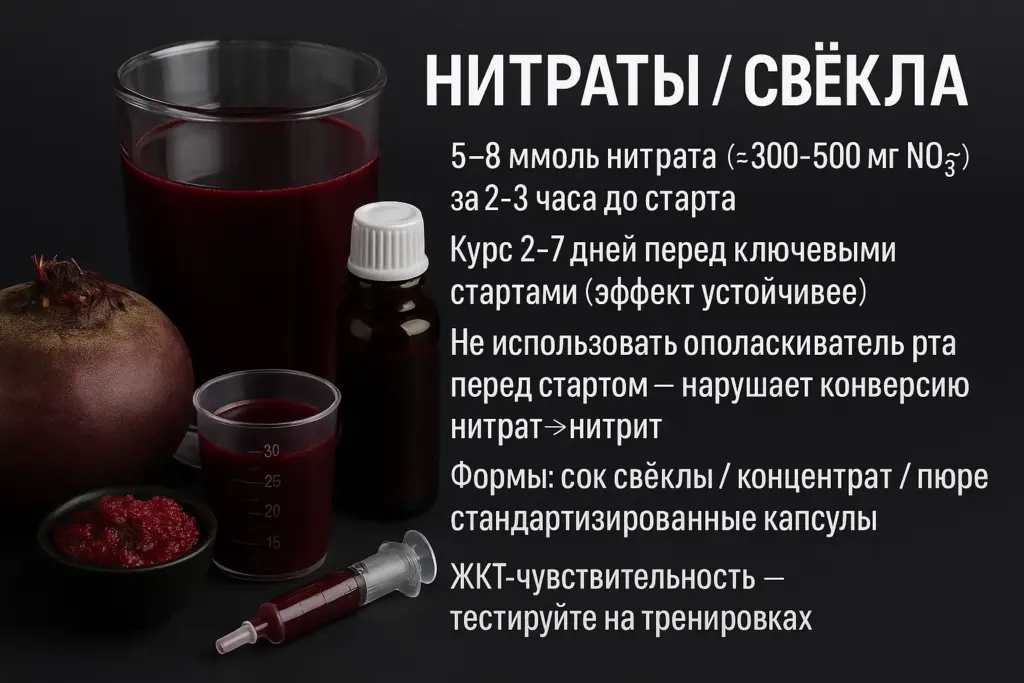 - 5–8 ммоль NO₃⁻ (≈ 300–500 мг нитрата) за 2–3 часа до старта.