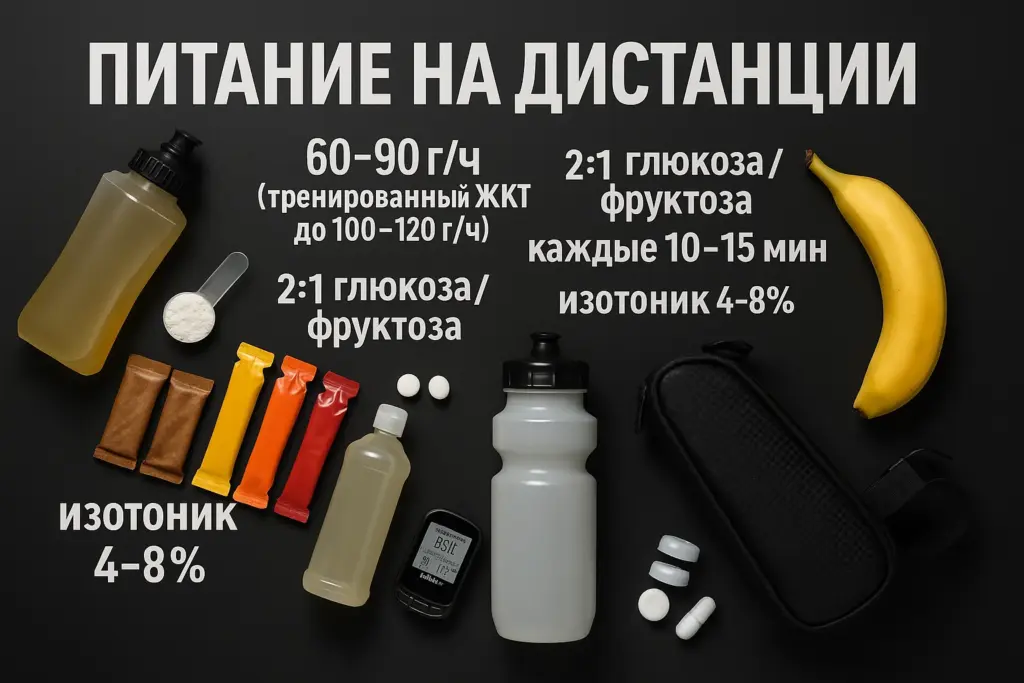 - Во время: 70–100+ г/ч (тренируйте ЖКТ!), строгий план электролитов.