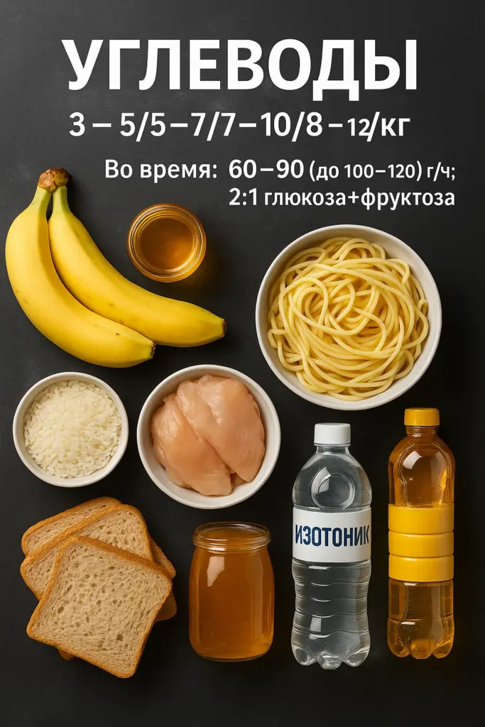 - Углеводы 6–10 г/кг/сут (пики до 12 г/кг), белок 1,8–2,0 г/кг/сут.