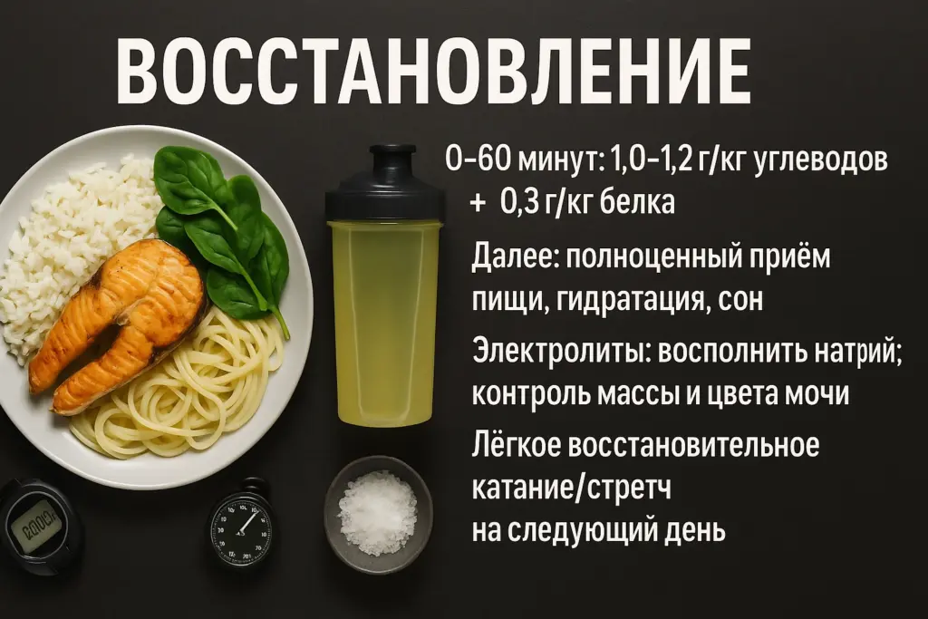 - Далее — полноценный приём пищи, сон, гидратация, лёгкое восстановительное катание/стретч.