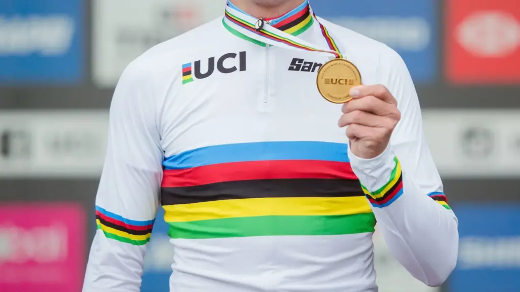 Белая джерси с пятью тонкими горизонтальными полосами — не просто трофей. Действующий чемпион обязан носить её во всех стартах своей дисциплины (например, победитель групповой гонки надевает её в однодневках и линейных этапах, но не в разделках). После окончания «срока» разрешены радужные канты на манжетах и воротнике — знак статуса на всю карьеру. Цвета полос соответствуют палитре UCI (и совпадают с цветами олимпийских колец).