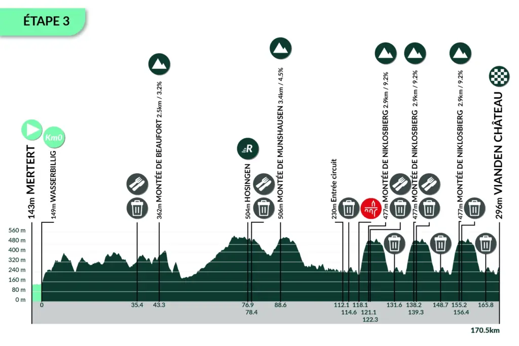 - Трижды Никлосбирг (Niklosbierg). Финальные 50 км — это «карусель» с тройным прохождением Никлосбирга, короткого, но очень колкого подъёма под Вианденом. На одном из вариантов подъём тянется около 3 км со средней ~9%, местами заметно круче. Здесь важна не только мощность, но и экономия — три повтора быстро «съедают» гликоген и тактические запасы.