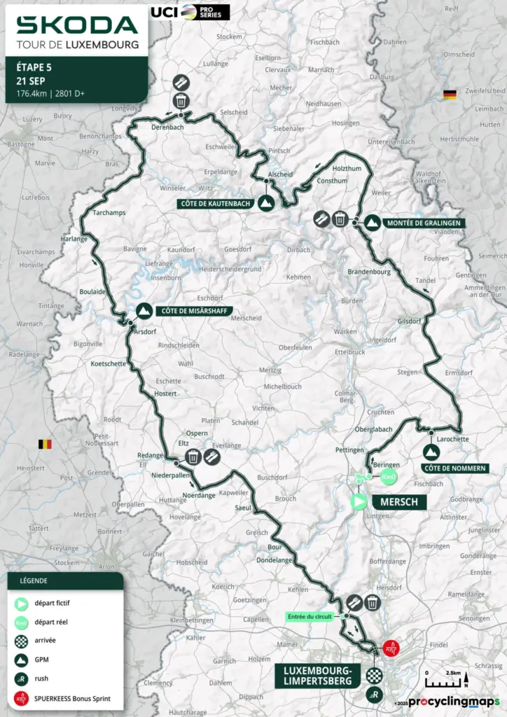 В воскресенье, 21 сентября 2025 года, гонка финиширует классическим «люксембургским» сценарием: Мерш → Люксембург (Лимpertsberg), 176,4 км, с ключевыми подъёмами на севере и тройным штурмом короткой, но злой стенки Pabeierbierg на городском круге. Финиш — Avenue Victor Hugo. Старт в 10:30, ожидаемое время финиша — 14:45 (CEST).