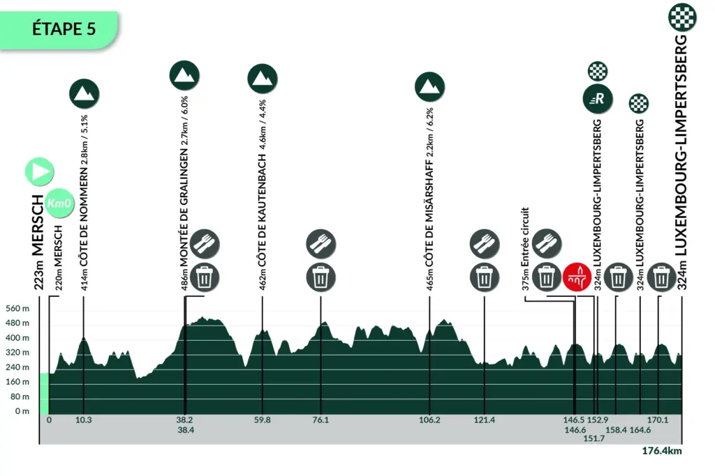 Традиционный финал идёт через цепочку холмов — Nommern, Gralingen, Kautenbach — с выходом на городской круг в Люксембурге. Кульминация — три прохождения Pabeierbierg: короткий отрезок ~800 м со средним уклоном около 10% (макс. ~15%), который разбивает группу и позволяет атаковать из позиции. Финиш — в районе Лимpertsberg.