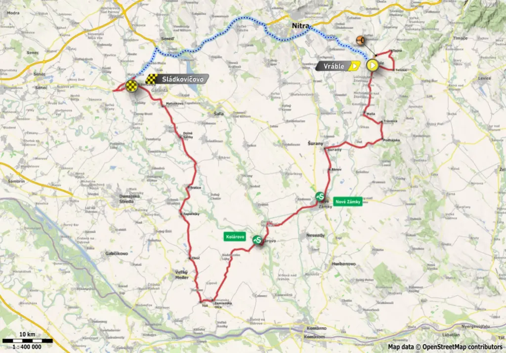 Этап пройдёт по открытым равнинам юго-запада Словакии: длинные прямые, широкие дороги, мало рельефа — классическая сцена для высокоскоростной погони и «паровозов» спринтерских поездов. Организаторы вынесли обе бонусные точки в населённые пункты с широкой уличной сеткой — здесь команды, ведущие борьбу за зелёную майку и секунды в GC, постараются собрать очки и бонификации, не рискуя целостностью пелотона. Горных премий нет вовсе, а общий набор высоты минимален — это один из самых «плоских» дней гонки.