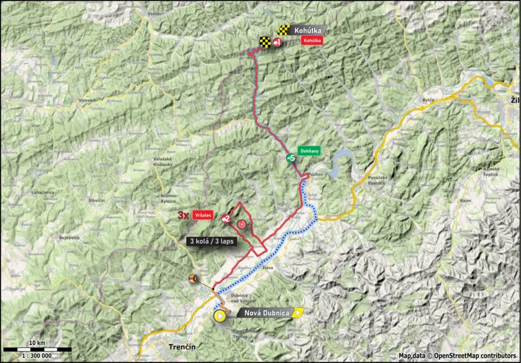 - Ключевые точки: три круга с подъёмом Vršatec (примерно 3,5 км в среднем по 7%, категория 2) на 24,9 / 47,8 / 70,7-м километрах; финиш на вершине Кохутка (категория 1). Промежуточный спринт — Dohňany (101,8 км).